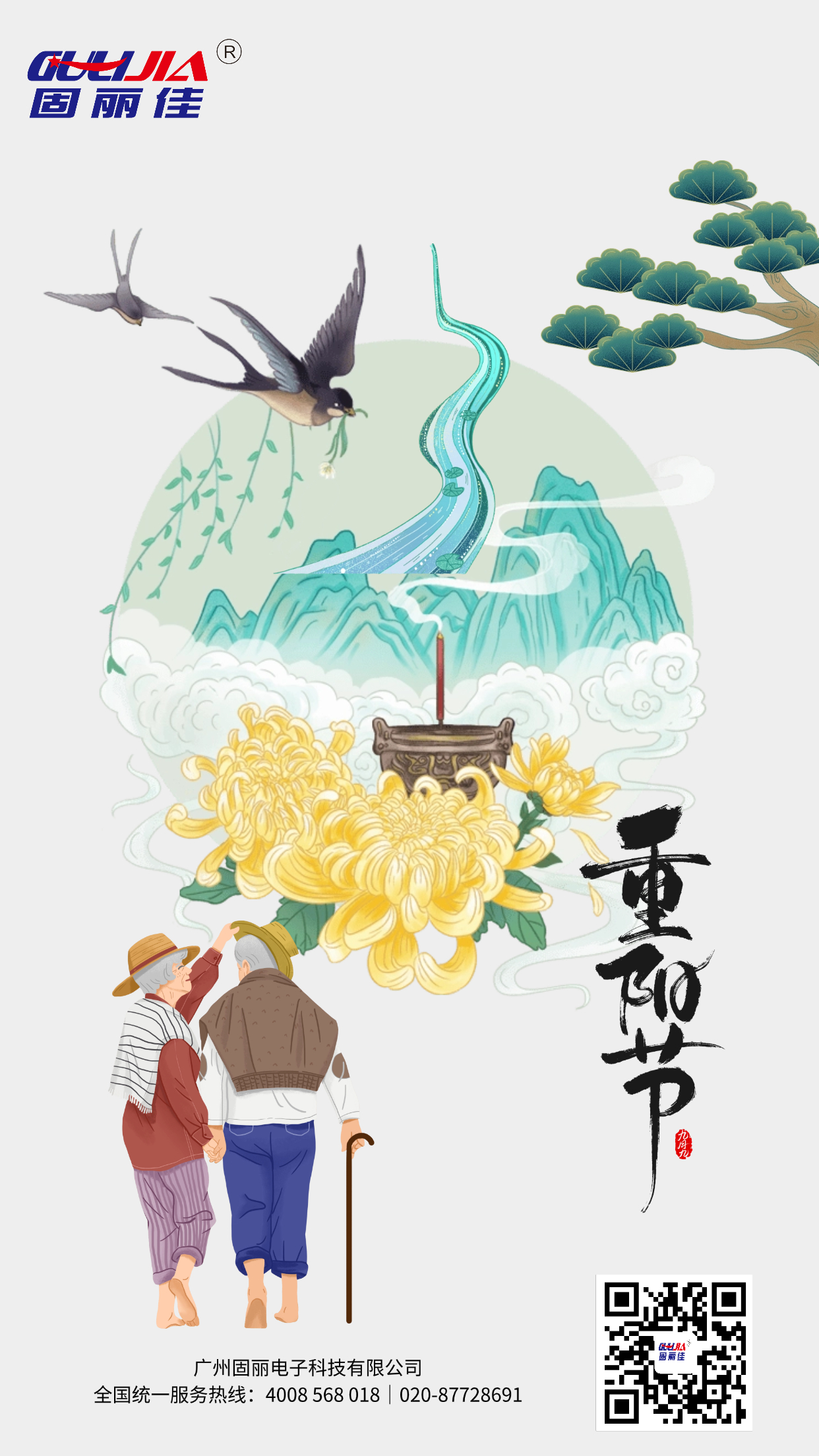 重陽節(jié),又稱重九節(jié)、茱萸節(jié)、登高節(jié)、敬老節(jié),時間在每年的農(nóng)歷九月初九,是中國慶祝豐收、祈福長壽、孝老思親的節(jié)日。《易經(jīng)》中將“九”定為陽數(shù),九月九日,日月并陽,故稱“重陽”。固麗佳全體同仁祝大家身體健康,開心長壽,歲歲安康!